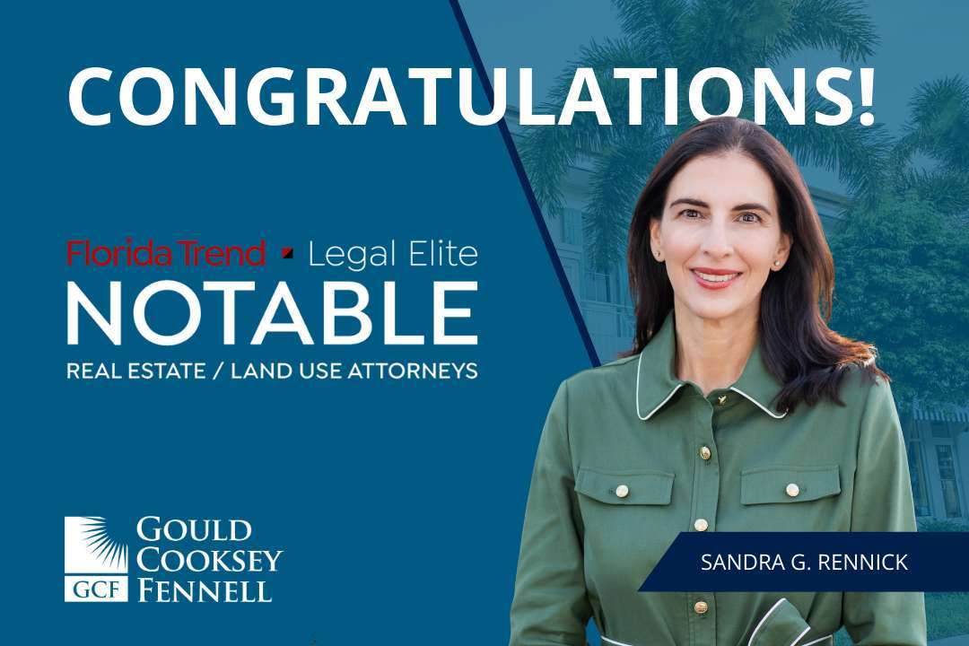 Gould Cooksey Fennell is proud to announce that partner Sandra G. Rennick has been selected to the Florida Trend Legal Elite NOTABLE – Real Estate / Land Use Attorneys list, an honor that highlights attorneys who demonstrate outstanding skill, client commitment, and professional integrity within Florida’s real estate law sector.